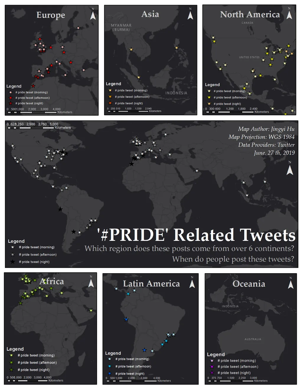 The figure visualizes the global spatial distribution of tweets containing the hashtag #Pride, aggregated across six continents and categorized by posting time (morning, afternoon, and night). Distinct spatial clusters are evident in North America and Europe, reflecting higher tweet density and sustained engagement throughout the day, while regions such as Asia, Africa, and Oceania exhibit more sparse but geographically diverse activity. The temporal differentiation highlights regional posting behaviors influenced by time zones and local social dynamics, demonstrating how social media activity related to #Pride varies both spatially and temporally at a global scale.