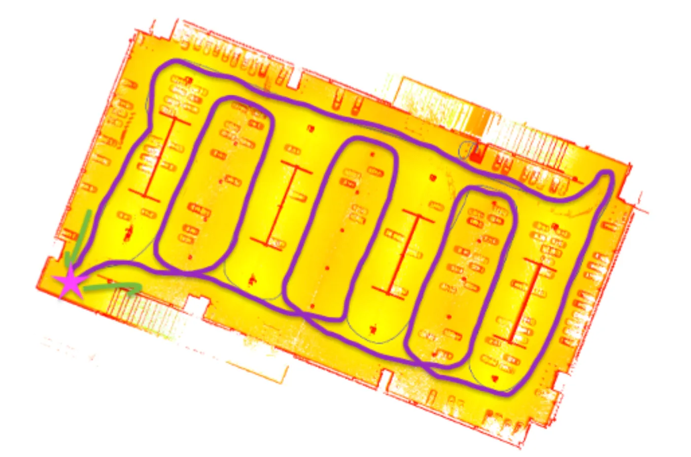 Enclosed loops in SLAM algorithms play a pivotal role in ensuring the accuracy, consistency, and efficiency of the map creation and localization process, which are essential for the reliable operation of autonomous robots and vehicles in dynamic environments. By completing a closed scan, people can comprehensively analyze related errors that occur in data resolution and adjust parameters to resolve these errors. Although the big loop in our data collection was enclosed, partial loops were not enclosed (refer to Scanning Trajectory), this may cause a series of misclosure. To minimize the error caused by IMU drift, optimized routes are proposed in Figures above as alternatives to walk the trajectory in enclosed loops. The pink start refers to the start/finish spot, the green arrows indicate the moving direction, and the purple/ blue line represents the refined trajectory.